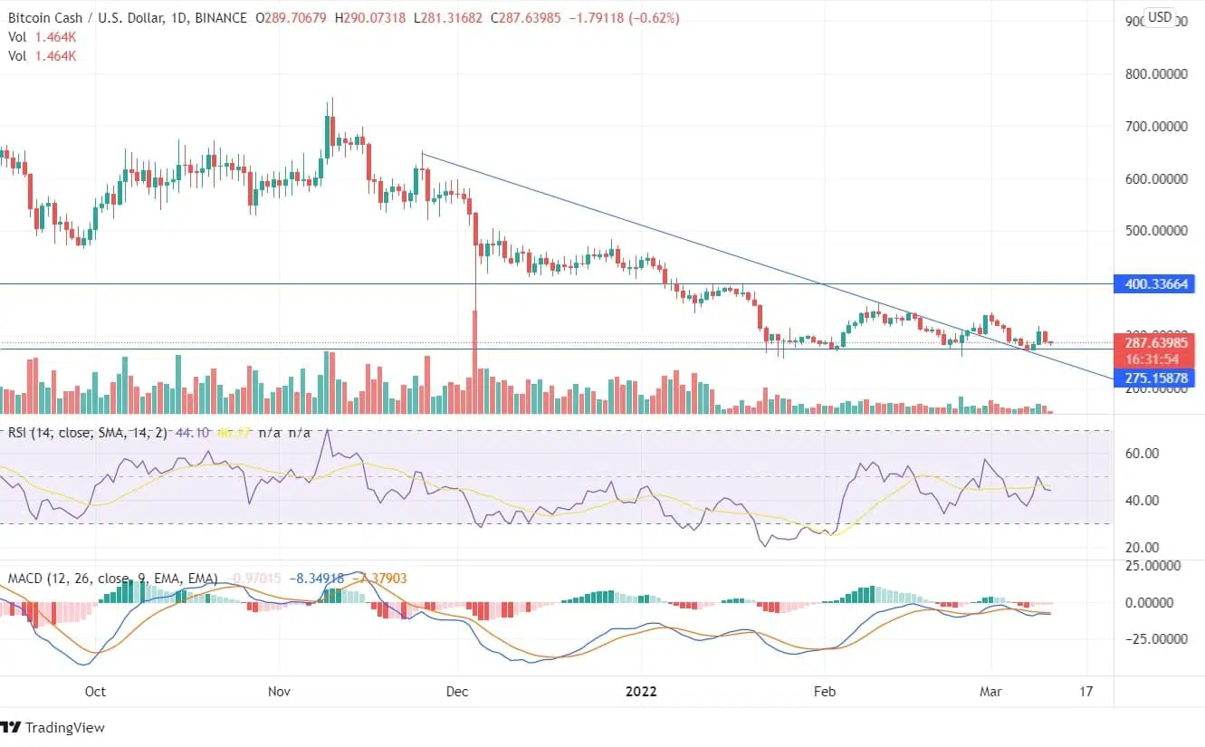 On the daily chart, the MACD line is nearby to the signal line and the histogram chart shows red diminishing candles thus not specifying any clear view of the upcoming price move. To find more information regarding the future potential of BCH, traders can explore price forecasts or do their own research. The RSI indicator is 44, is currently neutral, and may lead to any direction as pushed by the bears or the bulls. Once the coin takes a U-turn from this point, it may reach its top horizontal line of $400. However, if the coin closes below the swing low of $257, a robust downside momentum can be expected.